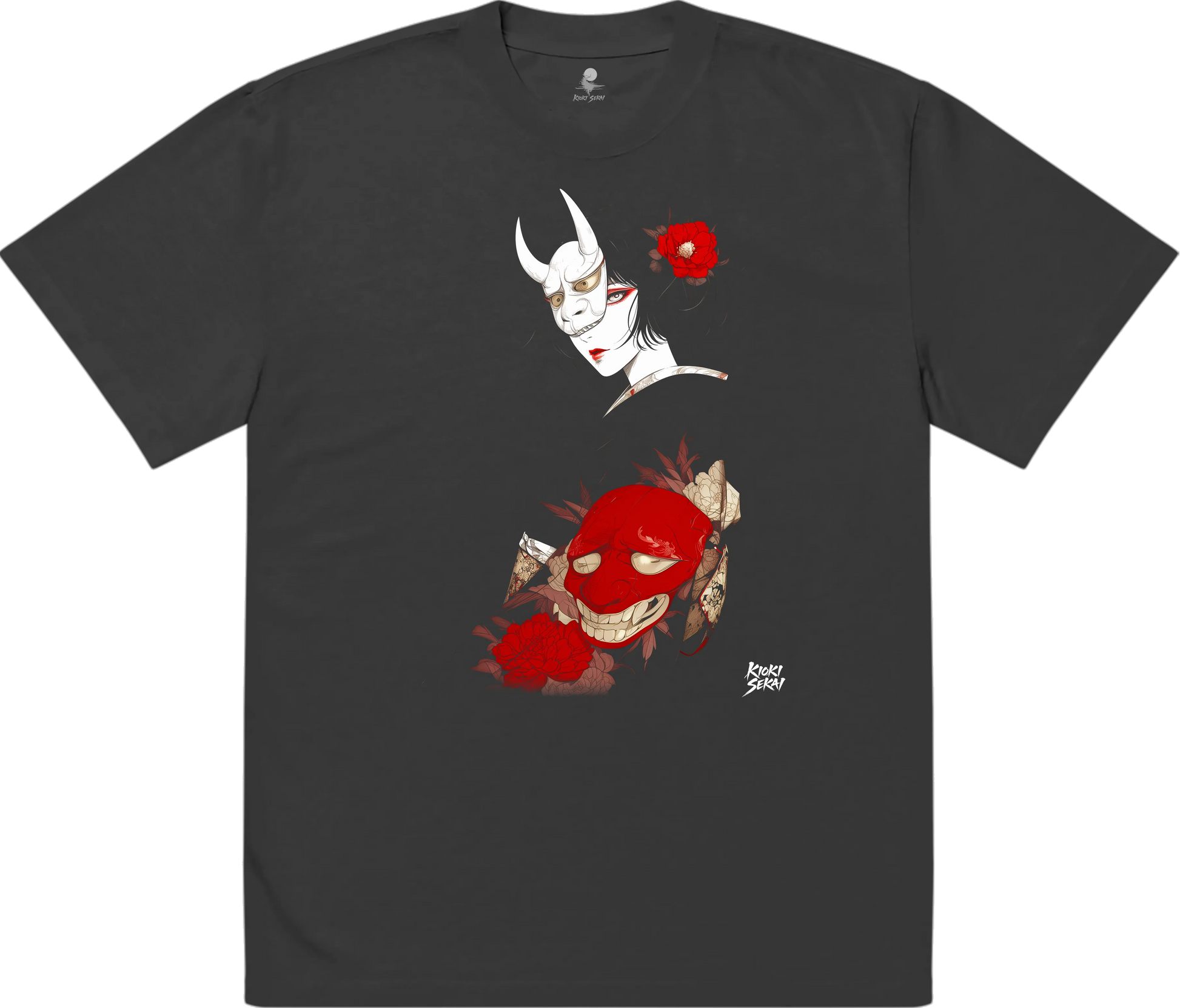 A dual-spirit composition featuring a pale hannya mask worn with cold elegance and a grinning crimson demon mask below, framed by deep red peonies—symbolizing the tension between restraint, desire and hidden wrath.
