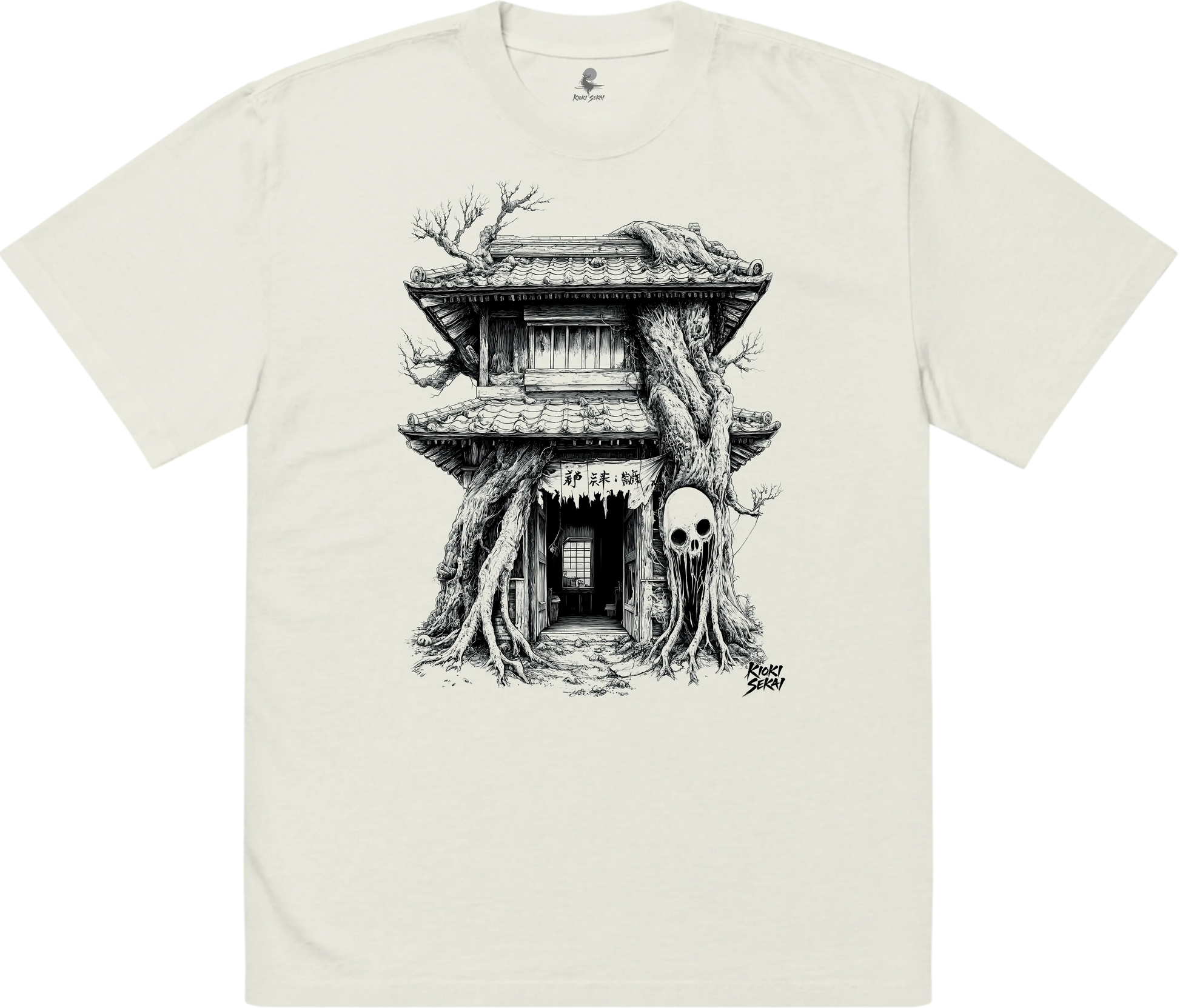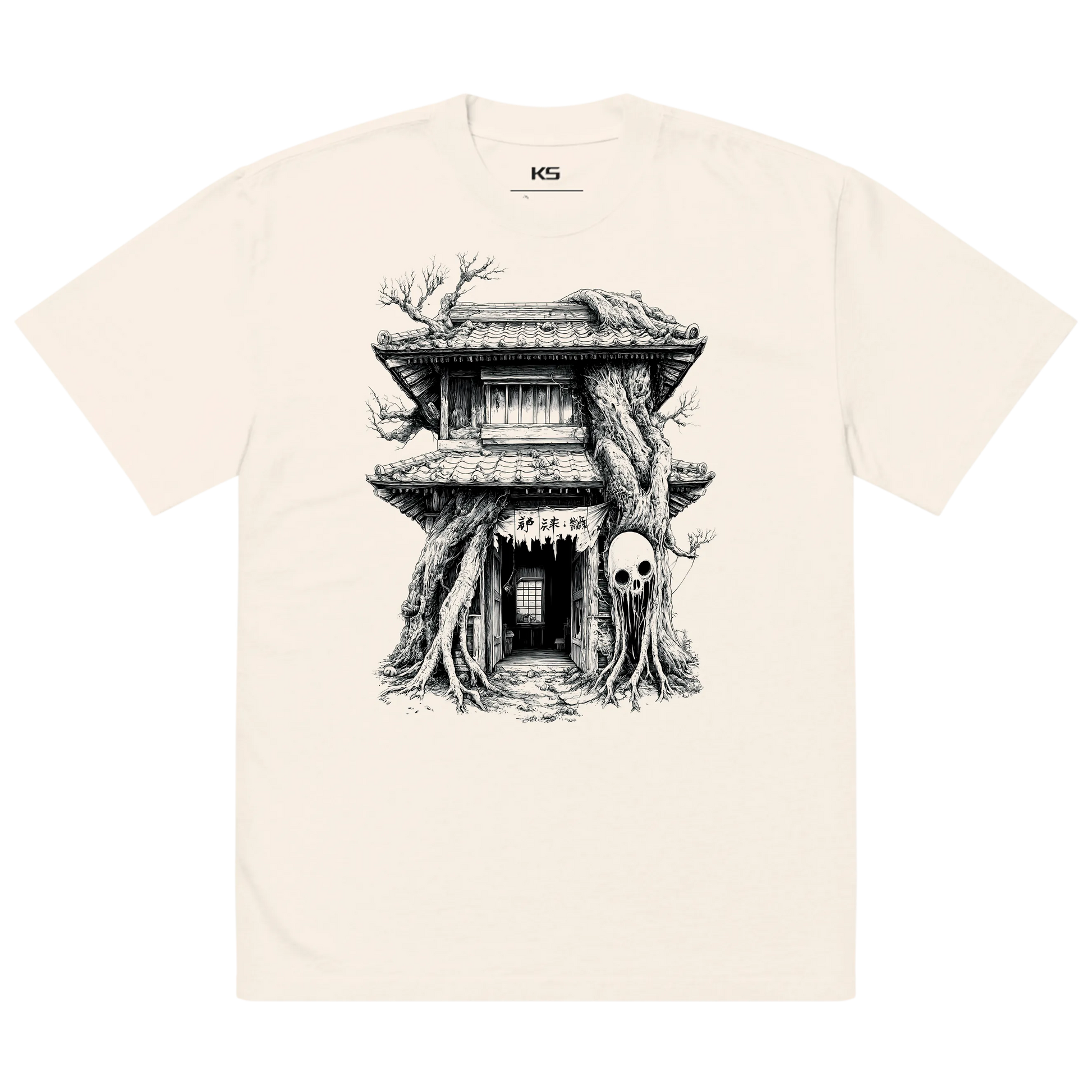 This premium oversized Japanese T-shirt features ethereal neo-traditional linework inspired by spiritual motifs, misty temples and calm atmospheres. Printed on a soft bone-white faded fabric, it enhances the collection’s minimal, timeless and spiritual identity.