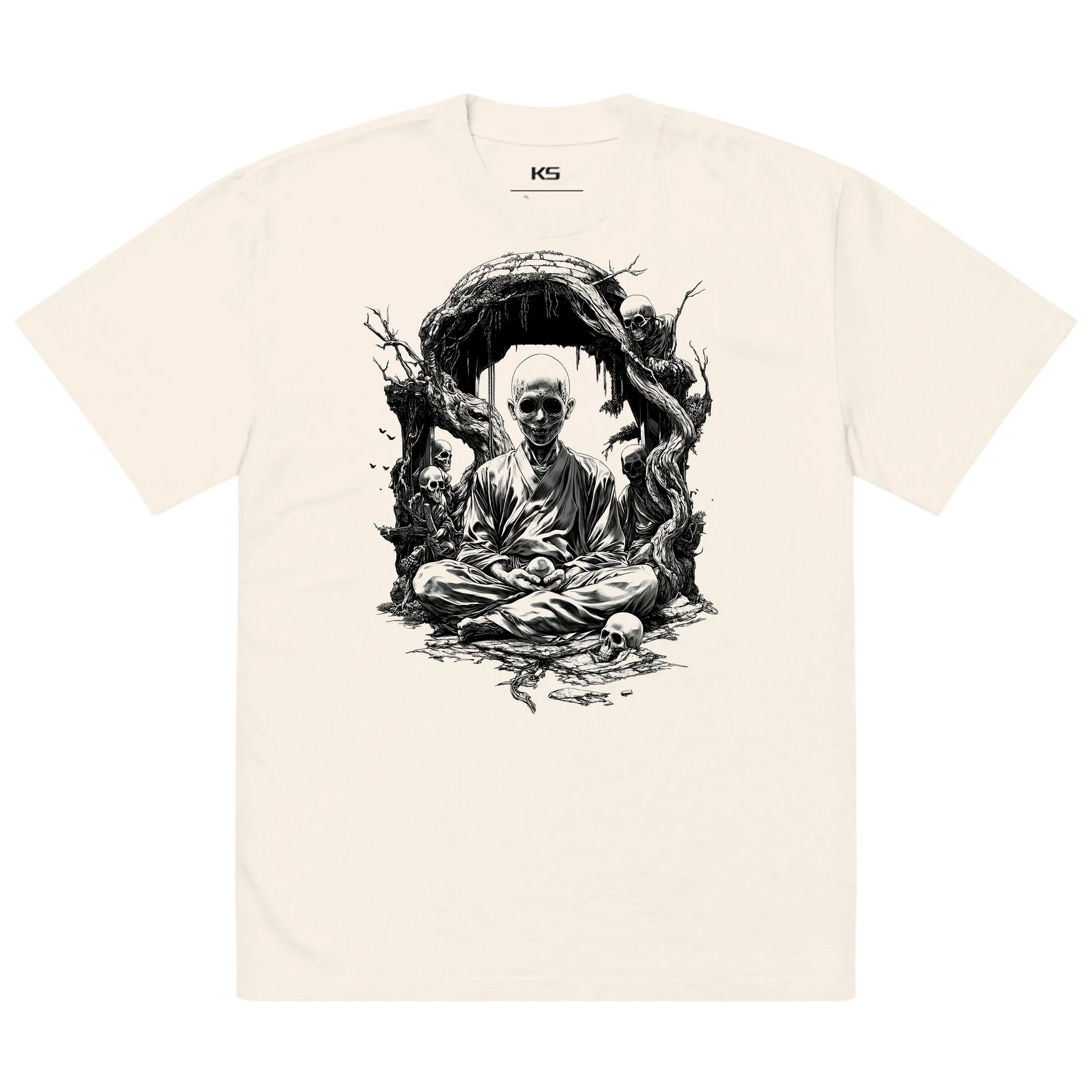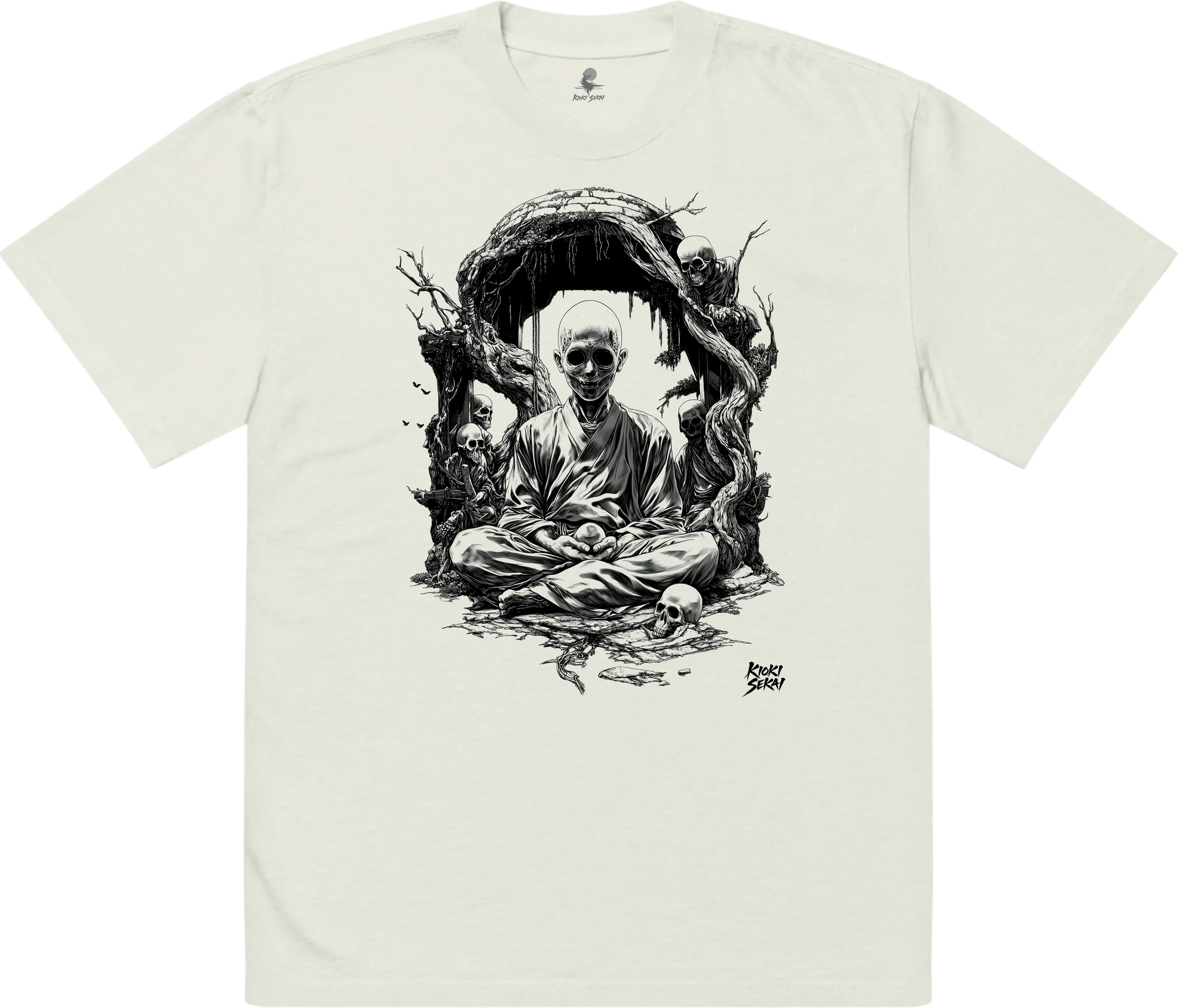 This premium oversized Japanese T-shirt features ethereal neo-traditional linework inspired by spiritual motifs, misty temples and calm atmospheres. Printed on a soft bone-white faded fabric, it enhances the collection’s minimal, timeless and spiritual identity.
