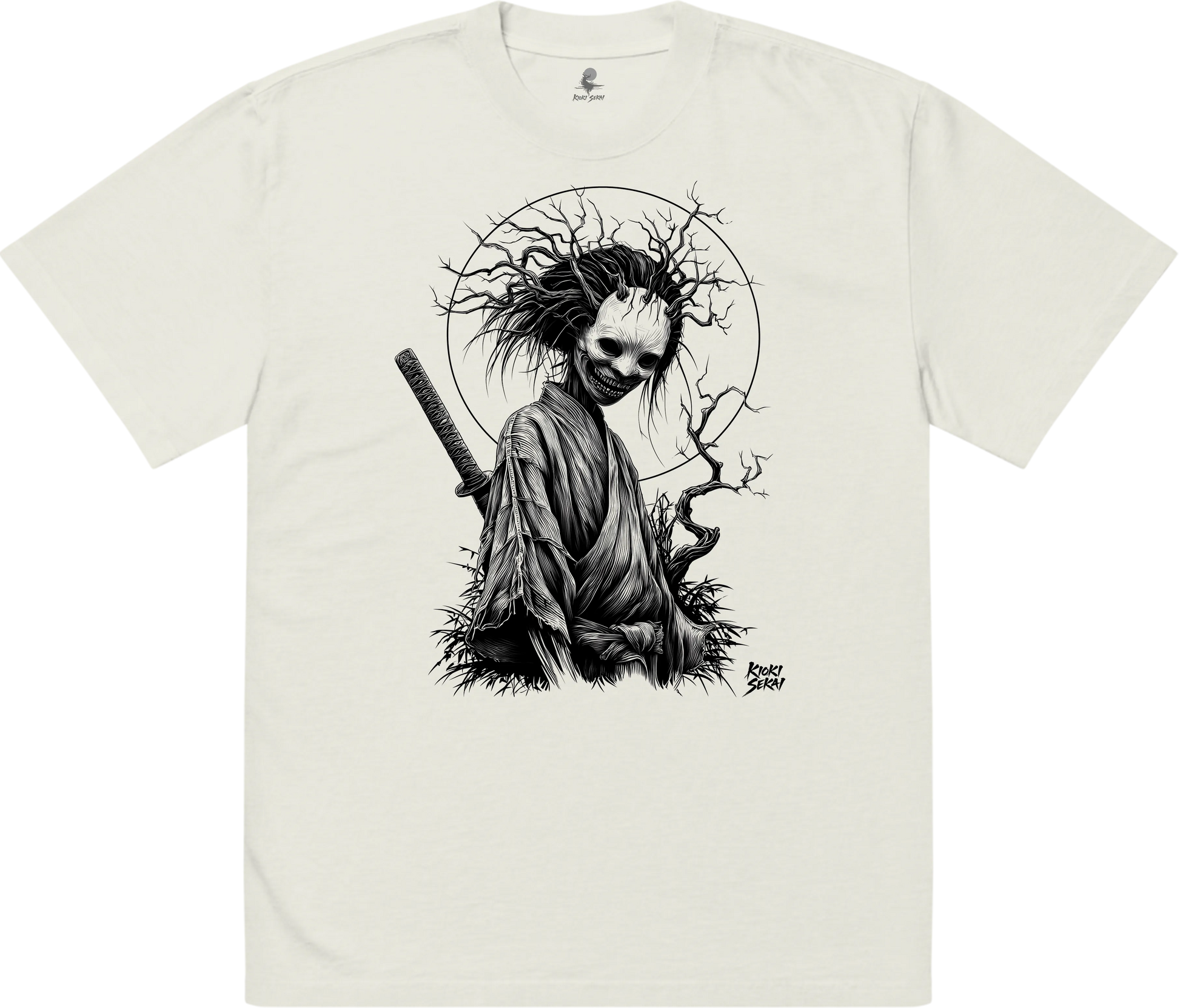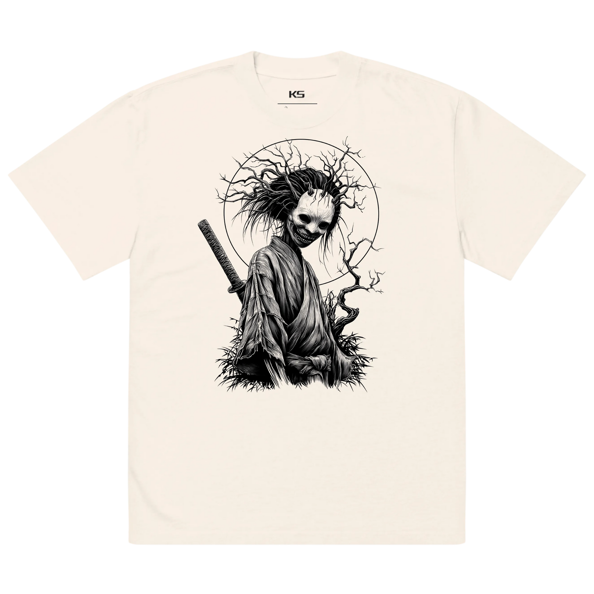 This premium oversized Japanese T-shirt features ethereal neo-traditional linework inspired by spiritual motifs, misty temples and calm atmospheres. Printed on a soft bone-white faded fabric, it enhances the collection’s minimal, timeless and spiritual identity.