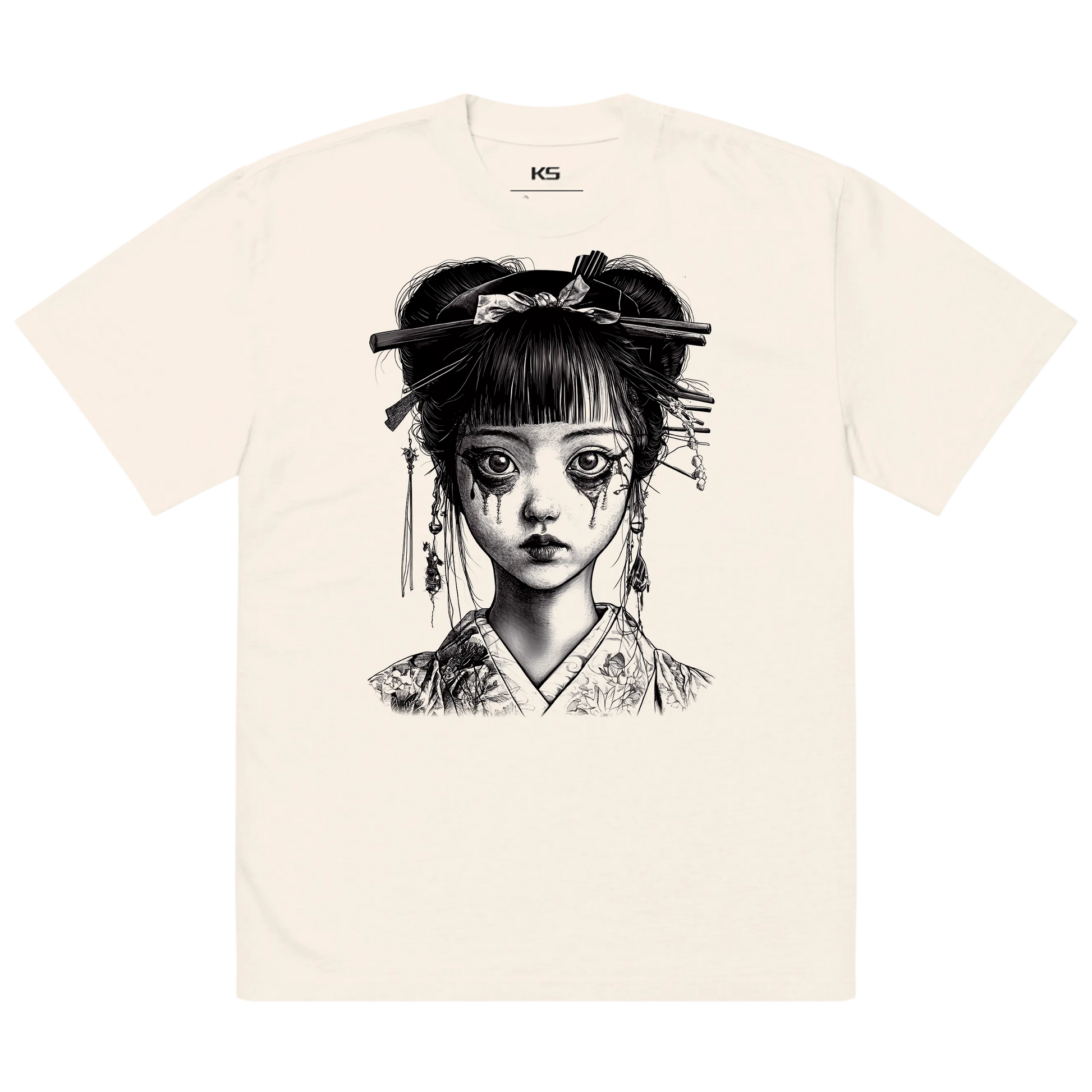 This premium oversized Japanese T-shirt features ethereal neo-traditional linework inspired by spiritual motifs, misty temples and calm atmospheres. Printed on a soft bone-white faded fabric, it enhances the collection’s minimal, timeless and spiritual identity.