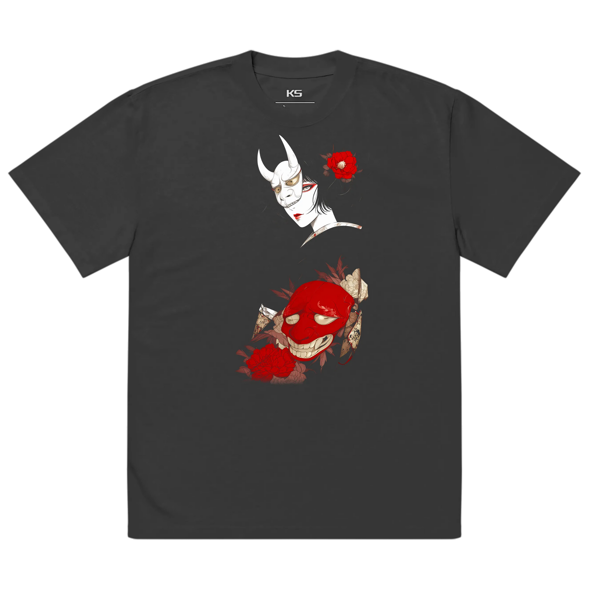 A dual-spirit composition featuring a pale hannya mask worn with cold elegance and a grinning crimson demon mask below, framed by deep red peonies—symbolizing the tension between restraint, desire and hidden wrath.