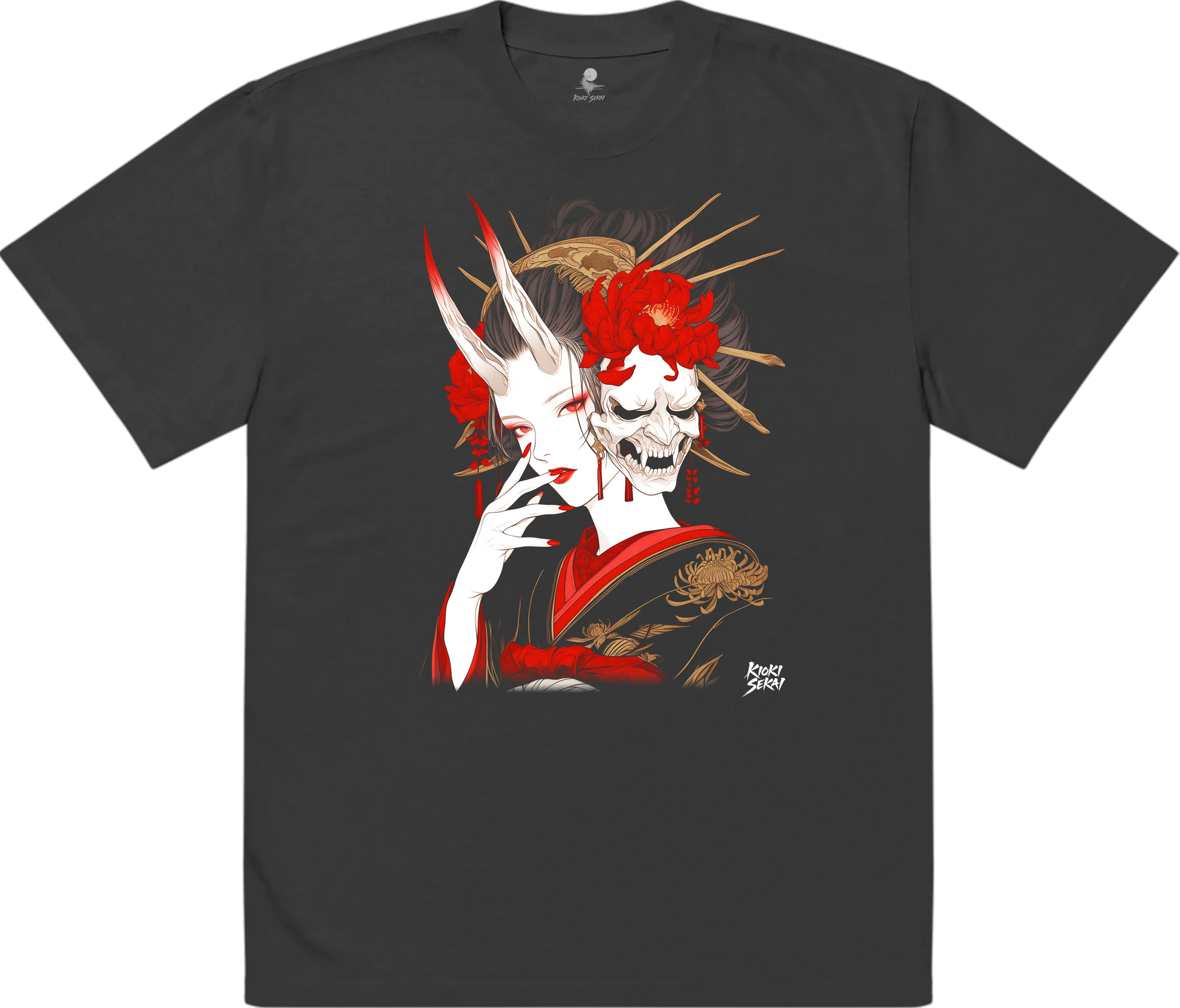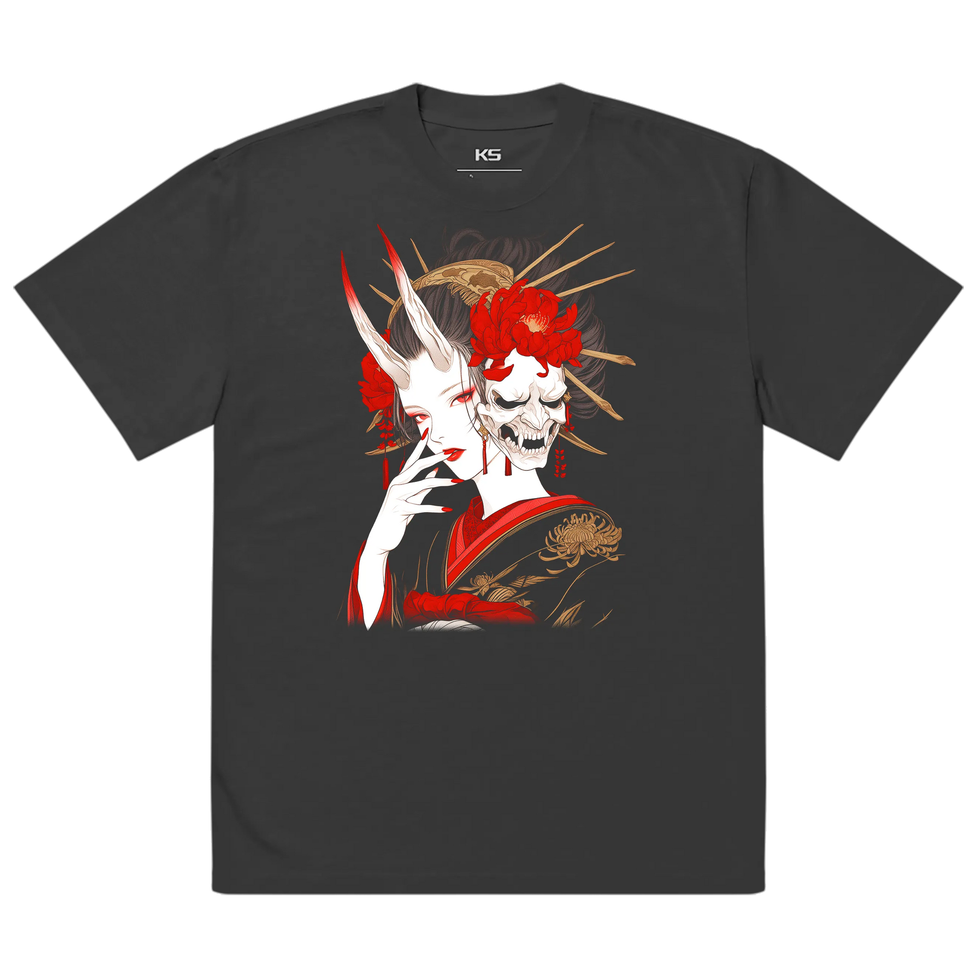 This premium oversized Japanese T-shirt features neo-traditional artwork inspired by oni symbolism, folklore, and shadowed aesthetics. Printed on a deep black faded fabric, it blends gothic influence with modern streetwear minimalism, creating a powerful and unsettling visual impact.