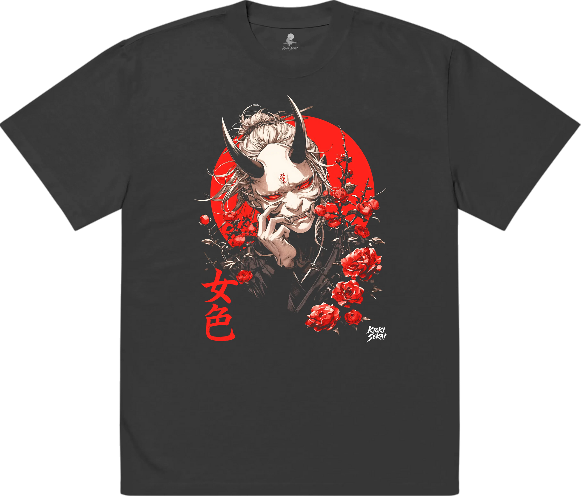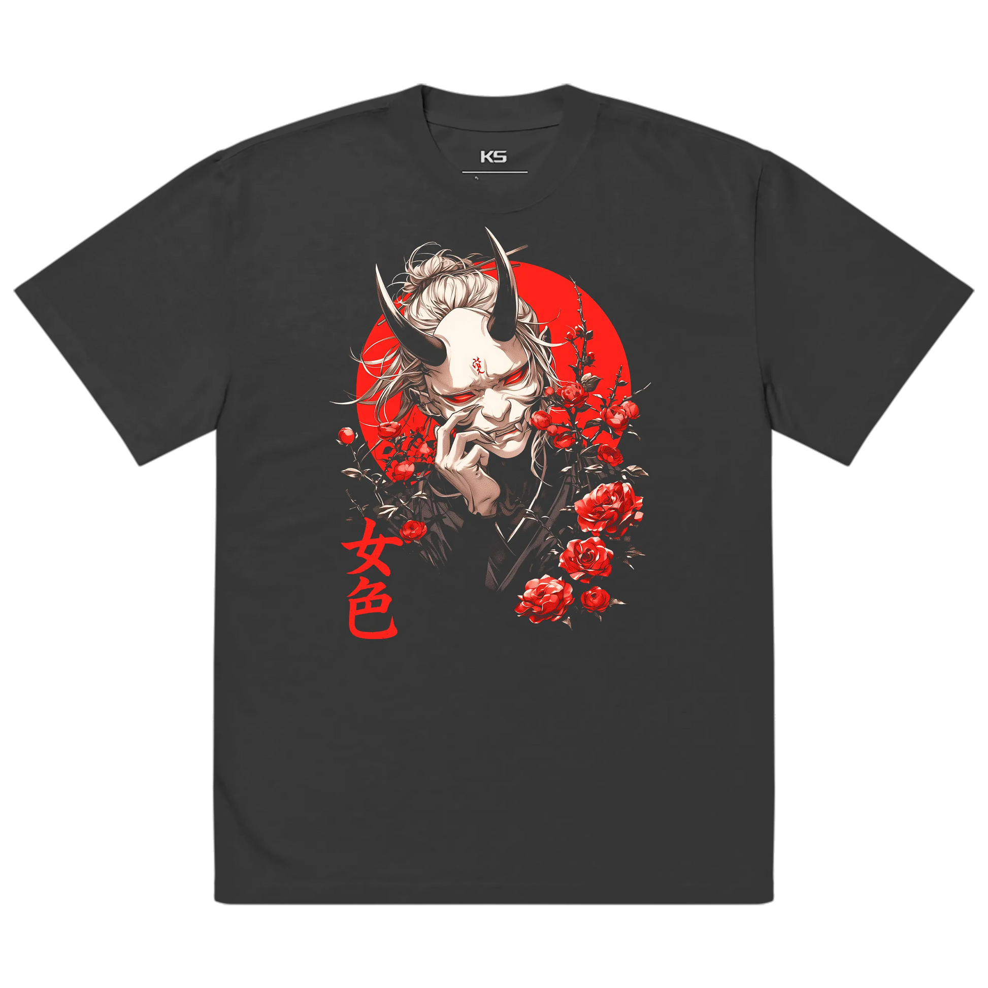This premium oversized Japanese T-shirt features neo-traditional artwork inspired by oni symbolism, folklore, and shadowed aesthetics. Printed on a deep black faded fabric, it blends gothic influence with modern streetwear minimalism, creating a powerful and unsettling visual impact.